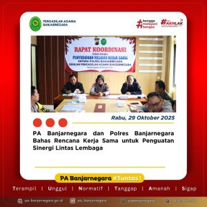 Banjarnegara – Rabu, 29 Oktober 2025. Dalam rangka memperkuat koordinasi antarinstansi penegak hukum dan pelayanan publik, Pengadilan Agama Banjarnegara menghadiri Rapat Koordinasi bersama Kepolisian Resor (Polres) Banjarnegara. Pertemuan ini merupakan tindak lanjut dari inisiatif penyusunan naskah kerja sama (MoU) antara kedua lembaga, yang bertujuan untuk memperkuat sinergi kelembagaan dan meningkatkan efektivitas layanan kepada masyarakat.