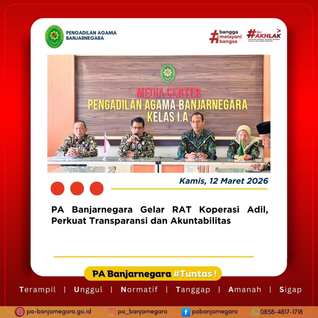 Banjarnegara, 12 Maret 2026 — Pengadilan Agama Banjarnegara kembali menyelenggarakan Rapat Anggota Tahunan (RAT) Koperasi Adil sebagai agenda rutin dalam rangka evaluasi dan pelaporan kinerja koperasi. Kegiatan ini dihadiri oleh seluruh anggota koperasi dan berlangsung dengan tertib serta penuh semangat kebersamaan.