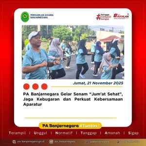 Banjarnegara — Jumat, 21 November 2025. Pengadilan Agama Banjarnegara kembali menyelenggarakan kegiatan rutin “Jum’at Sehat” berupa senam pagi bersama di halaman kantor. Kegiatan ini merupakan bagian dari komitmen lembaga dalam membangun budaya kerja yang sehat, energik, dan penuh kebersamaan di antara seluruh aparatur pengadilan.