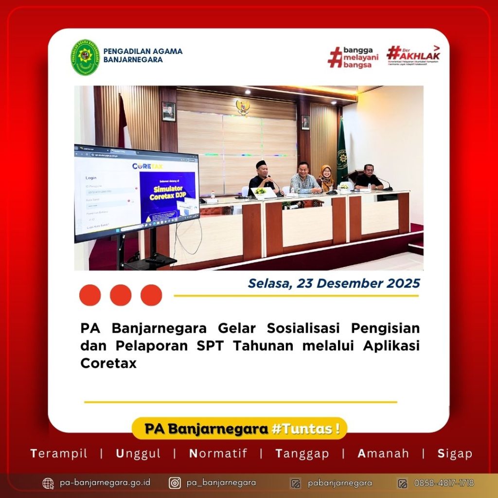 Banjarnegara, 23 Desember 2025. Pengadilan Agama Banjarnegara menyelenggarakan kegiatan sosialisasi pengisian dan pelaporan Surat Pemberitahuan Tahunan (SPT) melalui aplikasi Coretax yang bertempat di Ruang Aula Pengadilan Agama Banjarnegara. Kegiatan ini merupakan langkah nyata dalam meningkatkan pemahaman dan kepatuhan administrasi perpajakan di lingkungan aparatur peradilan.