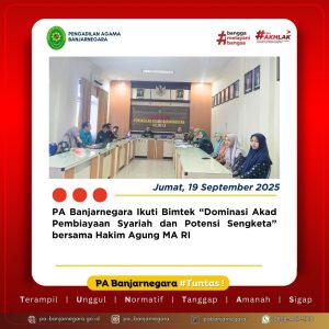 Banjarnegara – Jumat, 19 September 2025. Dalam rangka meningkatkan kapasitas sumber daya manusia di bidang hukum ekonomi syariah, seluruh tenaga teknis Pengadilan Agama Banjarnegara mengikuti Bimbingan Teknis (Bimtek) bertema “Dominasi Akad Pembiayaan Syariah dan Potensi Sengketa”. Kegiatan berlangsung di Ruang Media Center PA Banjarnegara dari pukul 08.00 hingga 11.00 WIB, diikuti dengan penuh antusias dan semangat belajar.