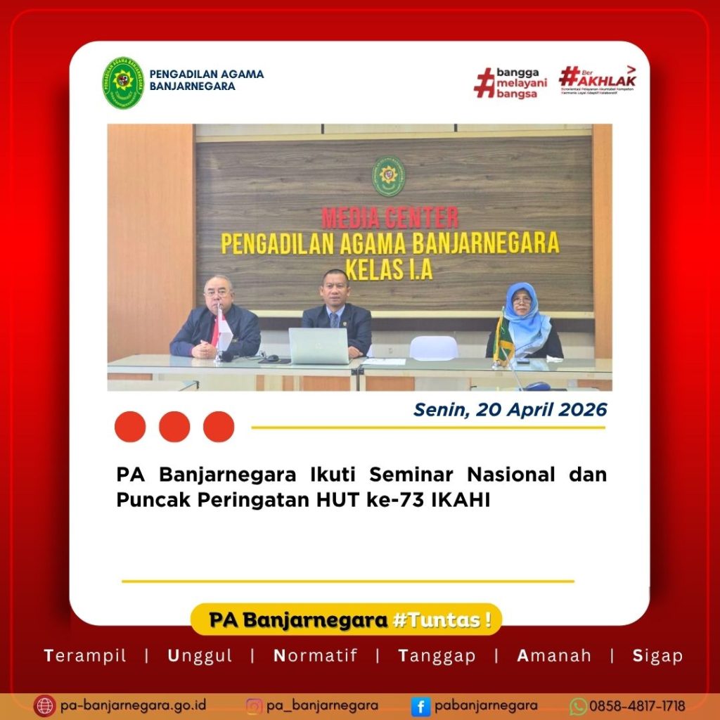 Banjarnegara, Selasa (21 April 2026) — Pengadilan Agama Banjarnegara mengikuti kegiatan Seminar Nasional dan Puncak Peringatan Hari Ulang Tahun ke-73 Ikatan Hakim Indonesia (IKAHI) yang diselenggarakan sebagai bagian dari rangkaian kegiatan nasional dalam memperkuat peran hakim dan lembaga peradilan di Indonesia.