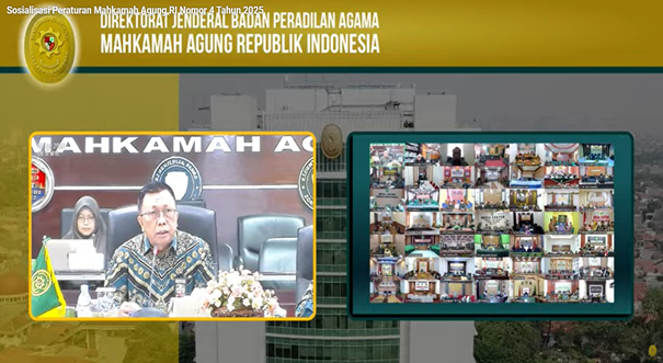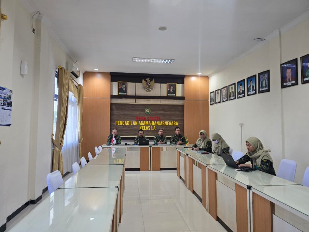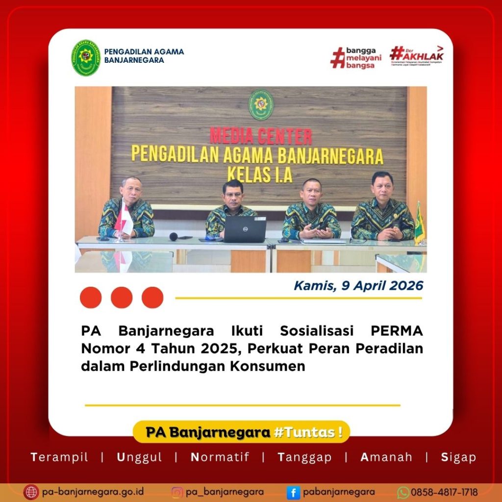 Banjarnegara, 9 April 2026 — Pengadilan Agama Banjarnegara mengikuti kegiatan Sosialisasi Peraturan Mahkamah Agung Republik Indonesia Nomor 4 Tahun 2025 tentang Tata Cara Mengadili Gugatan yang Diajukan oleh Otoritas Jasa Keuangan sebagai Upaya Perlindungan Konsumen. Kegiatan ini dilaksanakan secara daring melalui Zoom Meeting dan diikuti oleh unsur pimpinan serta para tenaga teknis dari Ruang Media Center.