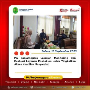 Banjarnegara – Dalam rangka memperkuat pelayanan publik di bidang bantuan hukum, Panitera Pengadilan Agama Banjarnegara, Fathul Hadi, S.H., M.H., bersama Panitera Muda Gugatan, Awwab Nafies, S.H., melaksanakan kegiatan Monitoring dan Evaluasi (Monev) terhadap pelaksanaan layanan Pos Bantuan Hukum (Posbakum).