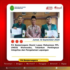 Banjarnegara – Jumat, 12 September 2025. Pengadilan Agama Banjarnegara menggelar acara pelepasan dua mahasiswa Universitas Sains Al-Qur’an (UNSIQ) Wonosobo yang telah menuntaskan masa Praktik Pengalaman Lapangan (PPL) di lingkungan PA Banjarnegara. Acara berlangsung di aula dengan suasana khidmat dan penuh apresiasi, dihadiri oleh jajaran pimpinan serta aparatur pengadilan.