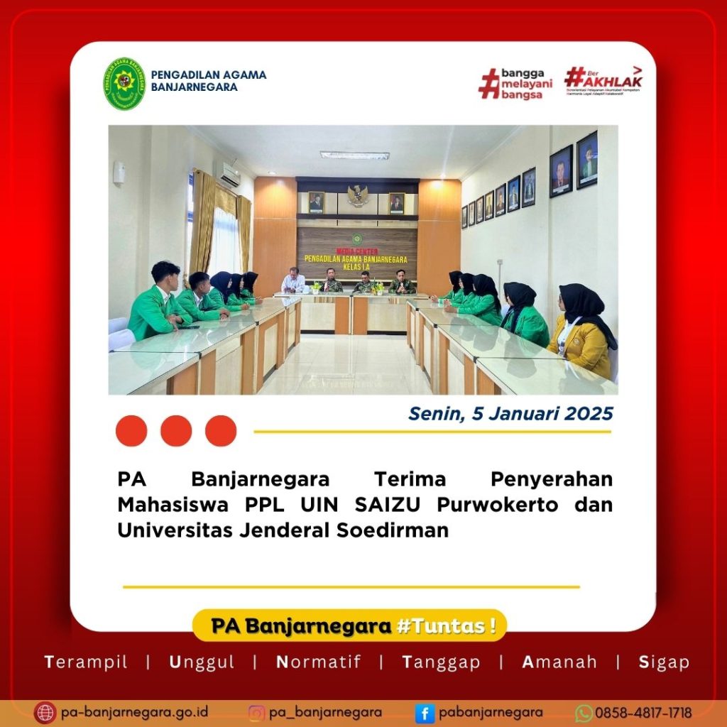 Banjarnegara — Senin, 5 Januari 2026. Suasana penuh antusiasme tampak menyelimuti Pengadilan Agama Banjarnegara saat dilangsungkannya kegiatan Penyerahan Mahasiswa Praktik Pengalaman Lapangan (PPL) dari UIN Prof. K.H. Saifuddin Zuhri (UIN SAIZU) Purwokerto dan Universitas Jenderal Soedirman (Unsoed). Kegiatan ini menjadi momen penting sebagai titik awal penguatan kolaborasi antara lembaga pendidikan tinggi dan lembaga peradilan dalam mendukung pembentukan kompetensi mahasiswa, khususnya dalam bidang hukum dan praktik peradilan.