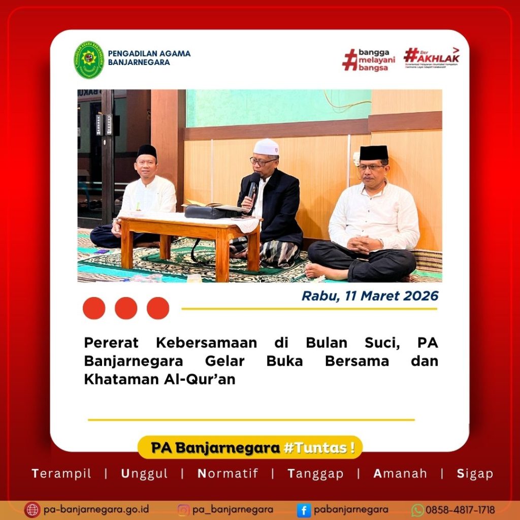 Banjarnegara, 11 Maret 2026 — Pengadilan Agama Banjarnegara menggelar kegiatan Buka Bersama dan Khataman Al-Qur’an yang diikuti oleh seluruh pimpinan, hakim, serta pegawai. Kegiatan ini berlangsung dengan khidmat dan penuh makna, menjadi salah satu momentum penting dalam mempererat tali silaturahmi serta meningkatkan semangat kebersamaan di bulan suci Ramadan.