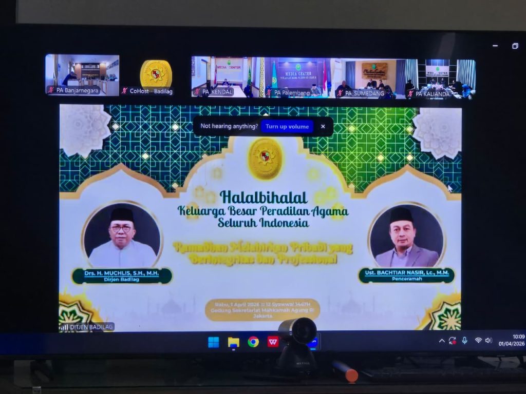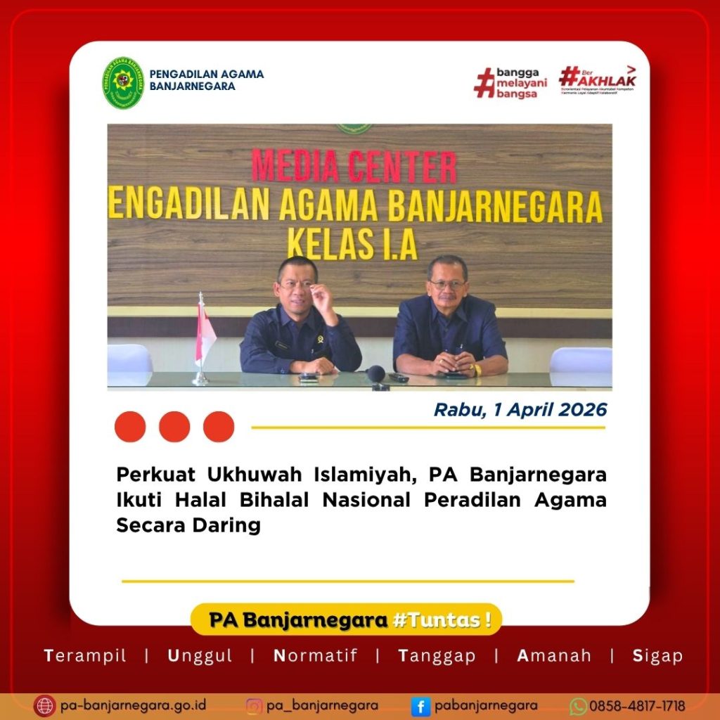 Banjarnegara, Rabu (1 April 2026) — Pengadilan Agama Banjarnegara mengikuti kegiatan Halal Bihalal Keluarga Besar Peradilan Agama Seluruh Indonesia yang diselenggarakan oleh Direktorat Jenderal Badan Peradilan Agama Mahkamah Agung Republik Indonesia secara daring melalui Zoom Meeting.