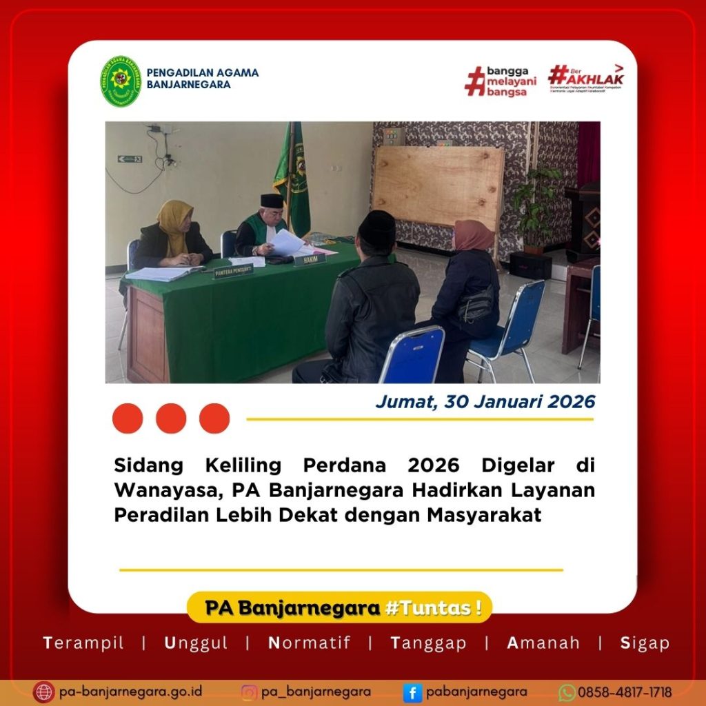 Banjarnegara, 30 Januari 2026 — Pengadilan Agama Banjarnegara secara resmi menyelenggarakan sidang di luar gedung perdana Tahun 2026 sebagai wujud nyata komitmen dalam meningkatkan akses keadilan bagi masyarakat. Kegiatan ini dilaksanakan di Aula Kantor Kecamatan Wanayasa dan mendapat sambutan antusias dari warga setempat yang memanfaatkan layanan peradilan secara langsung di wilayah mereka.