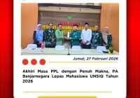 Banjarnegara, Jumat (27 Februari 2026) — Pengadilan Agama Banjarnegara melaksanakan kegiatan pelepasan Mahasiswa Praktik Pengalaman Lapangan (PPL) dari Universitas Sains Al-Qur’an (UNSIQ) yang telah menyelesaikan masa praktik di lingkungan Pengadilan Agama Banjarnegara. Kegiatan pelepasan dilaksanakan dalam suasana hangat dan penuh kebersamaan, serta dihadiri oleh pimpinan. Momentum ini menjadi penanda berakhirnya rangkaian pembelajaran lapangan yang telah… Read More »